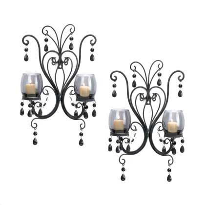 • Dark and mysterious, this pair of wall sconces will turn candlelight into a dramatic lighting accent with two smoked glass candle cups set in a scrolling black metal frame.